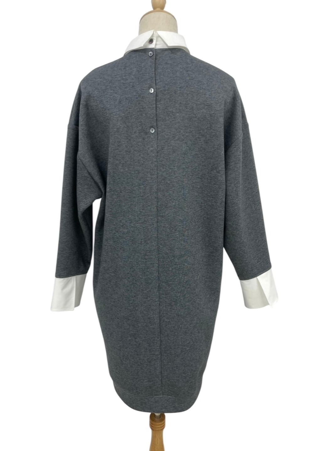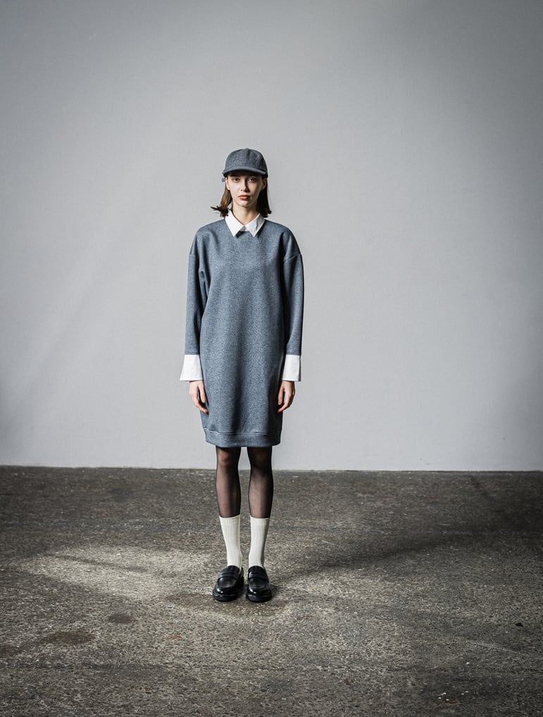 ホワイトシャツをレイヤードしているかの様な、クラシカルなワンピースをスウェット素材で