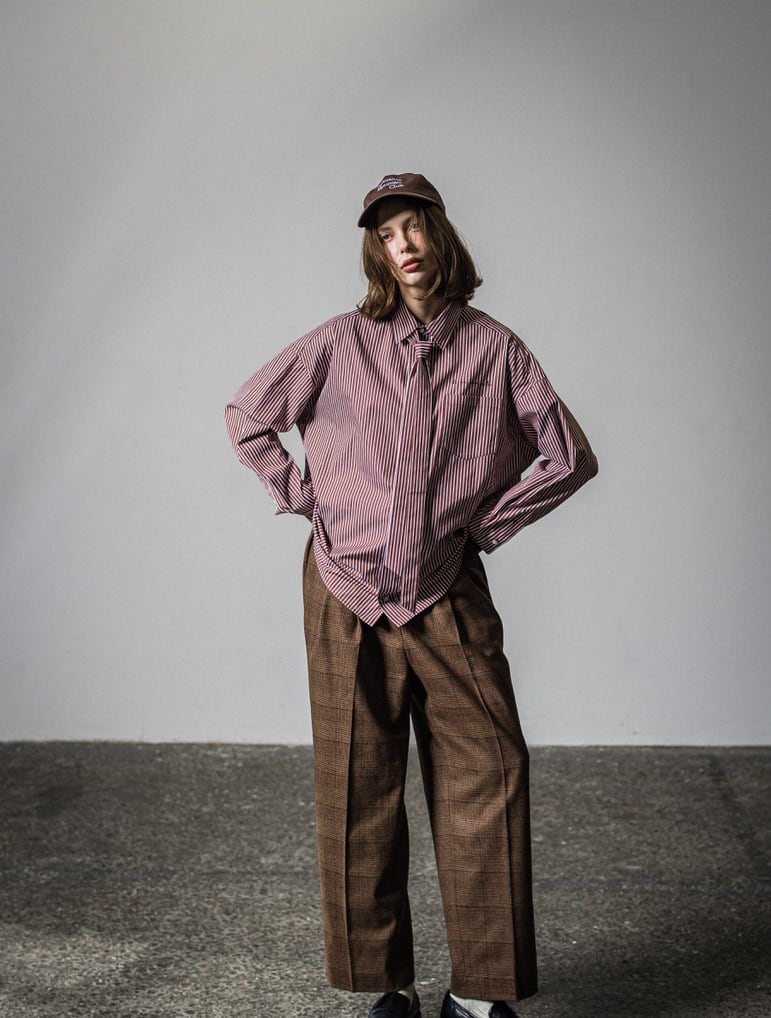 同素材のスキニータイ付きのマニッシュなストライプシャツ。