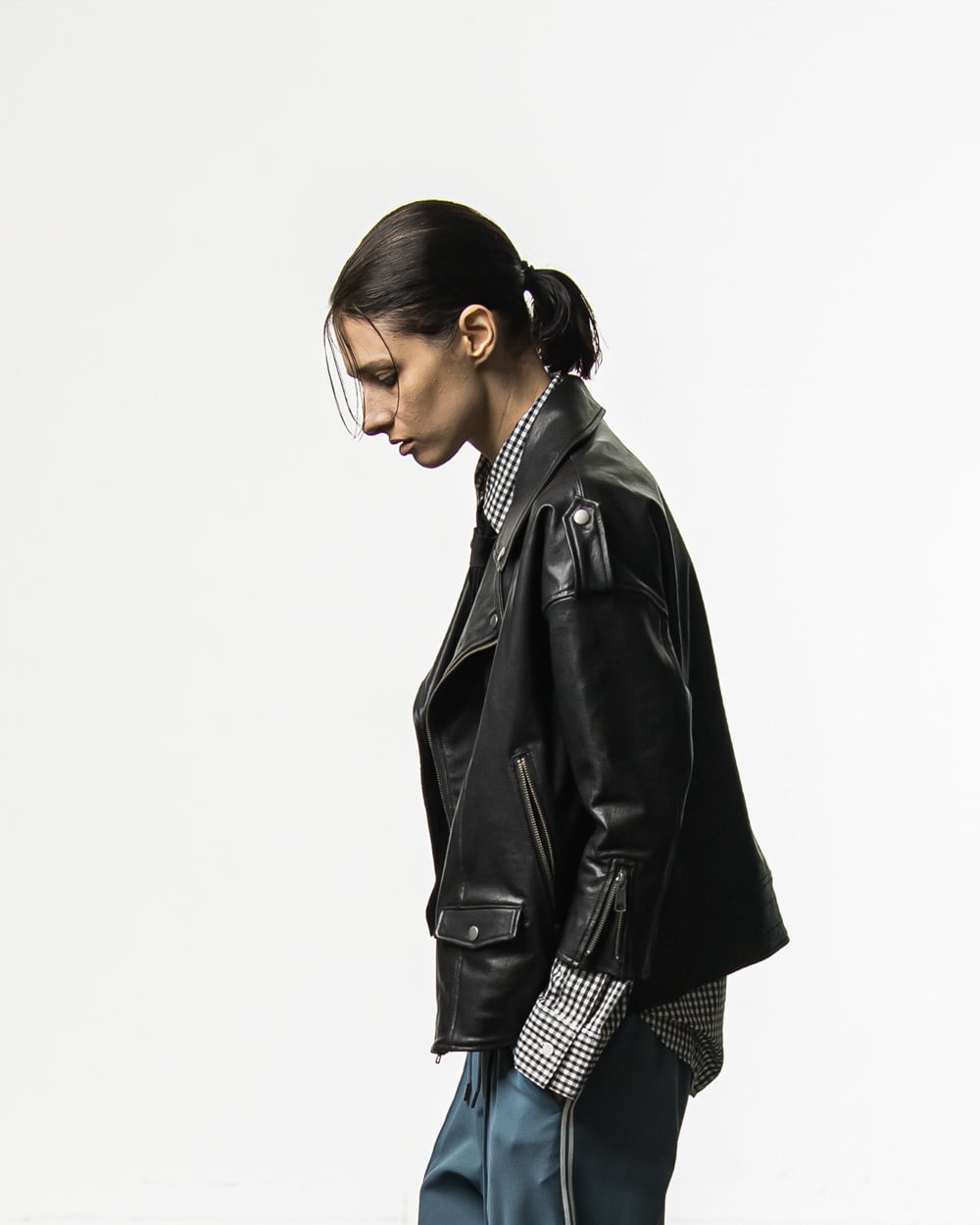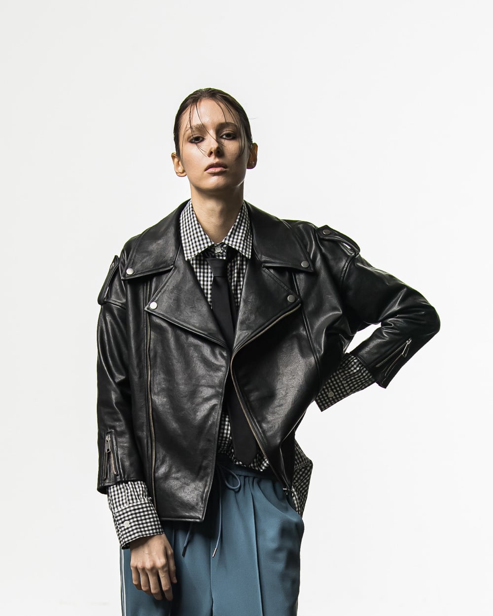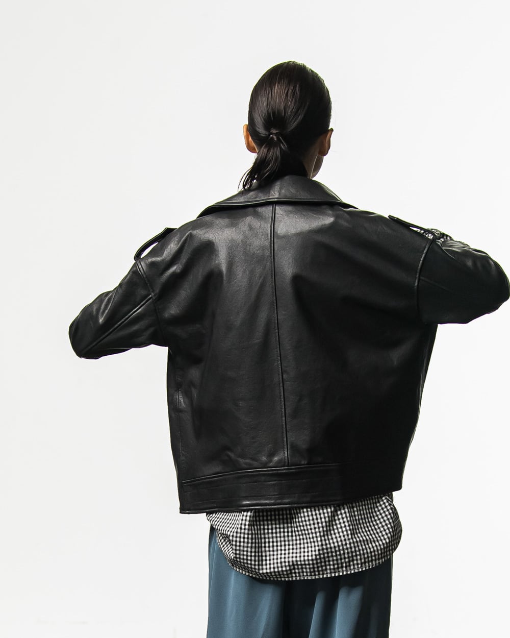 しっかりとした肉感のラムレザーを使用し、ゆるいサイズ感でリラックスしたライダースブルゾンに。レングス、袖丈は短めでバランス良く仕上げています。