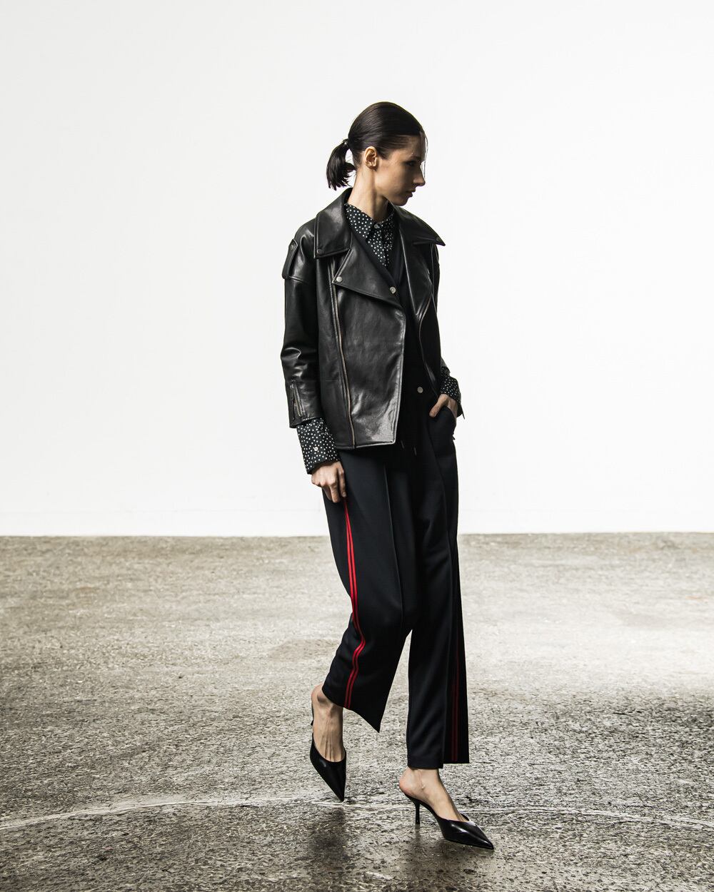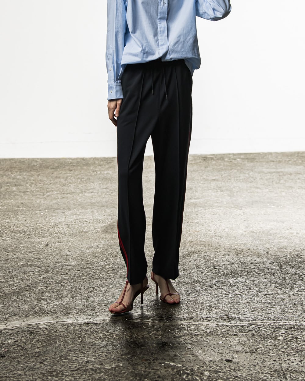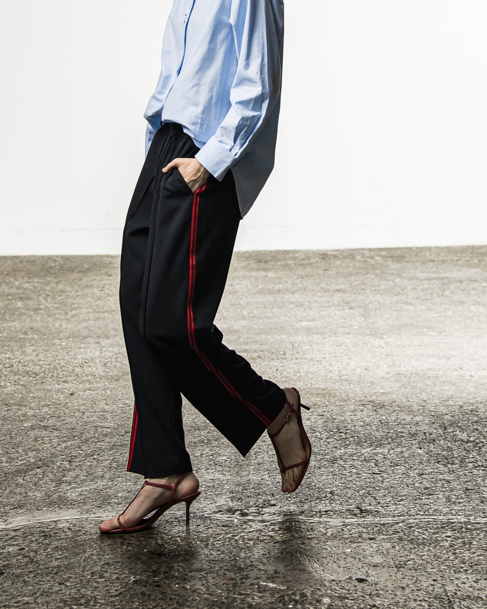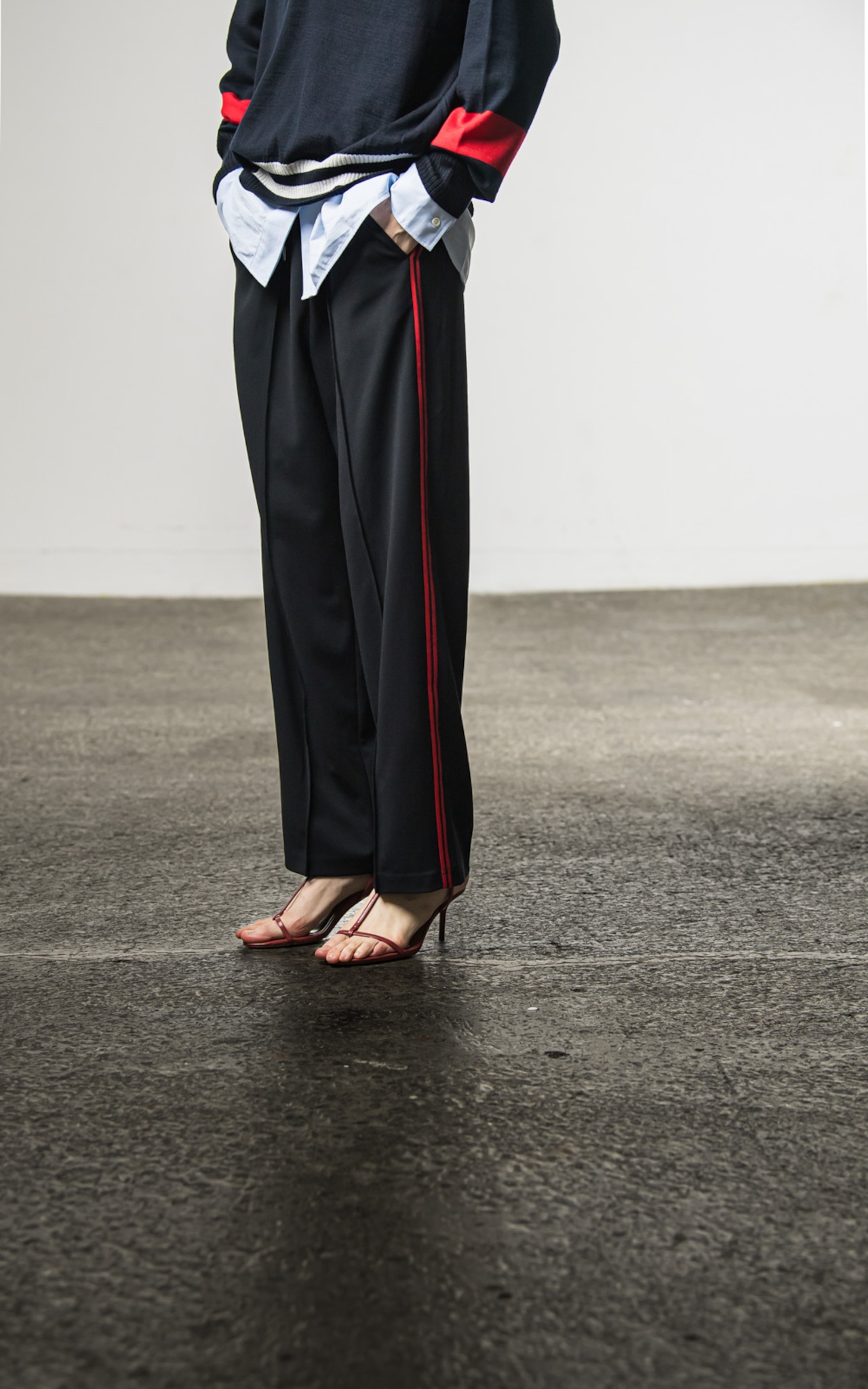布帛の様に見えるジョーゼットジャージの素材を使用し、緩めストレートラインのトラックパンツに仕上げています。サイドのラインはグログランテープで少しモードに。